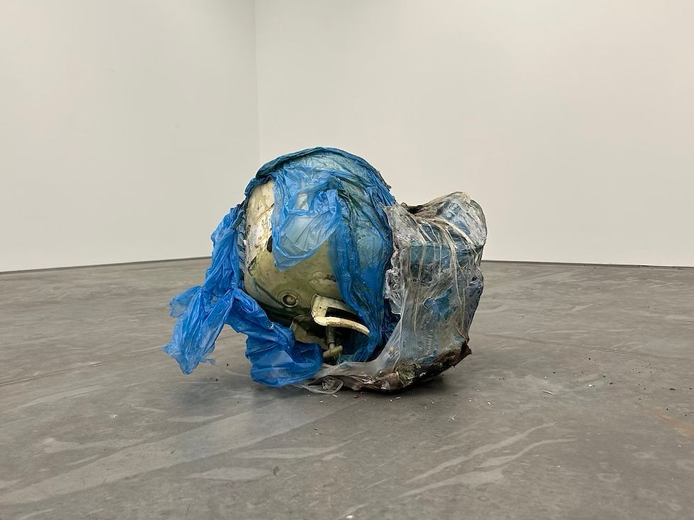 Ripped Candle, steel tube, coolant reservoir, electrical tape, soil saturated in waste oil